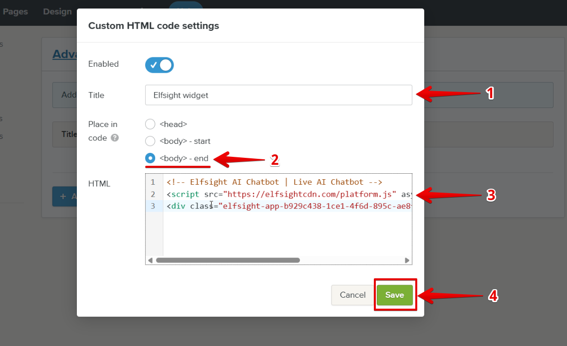 <body> - endoption is selected, paste the widget installation code, and click Save: