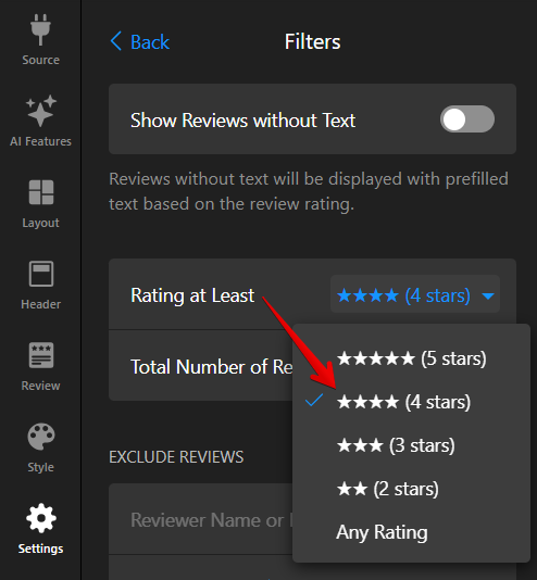 You can select a minimum rating from 2 to 5 stars. For example, setting the Rating at Least filter to 4 stars will display only reviews rated 4 or 5 stars: