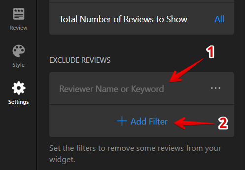Exclude Reviews: Remove reviews containing specific names or keywords. Enter the name or keyword in the Exclude Reviews field (1). To add more filters, click the + Add Filter button (2):
