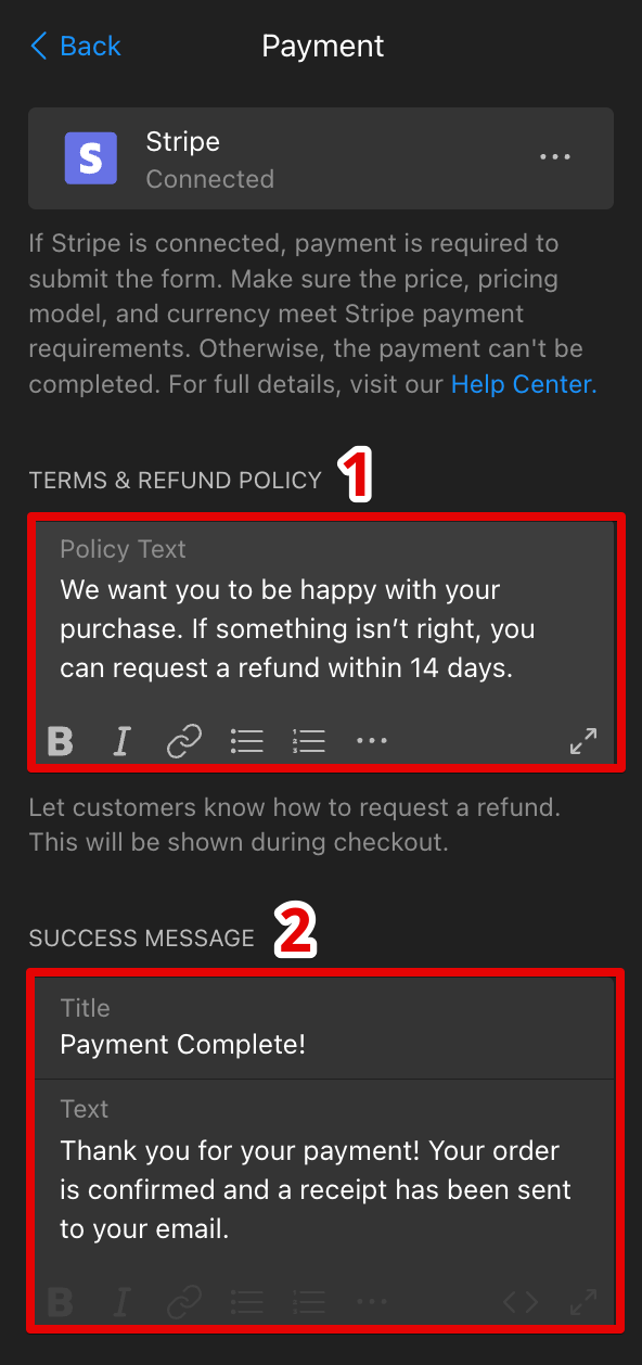 After connecting Stripe, you can optionally customize a few payment-related settings in the Payment section: