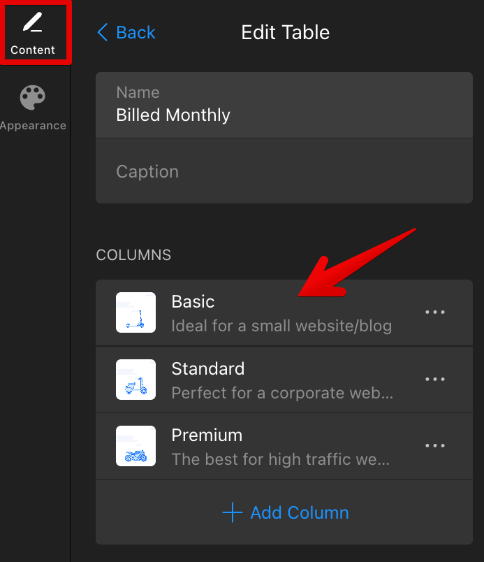 If you use Multiple Tables Mode, first select the table you want to edit, then click the needed column.