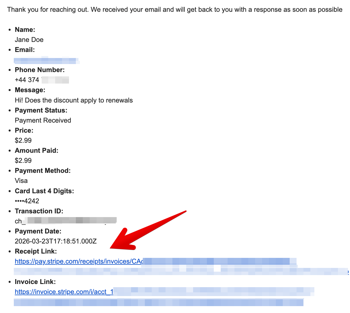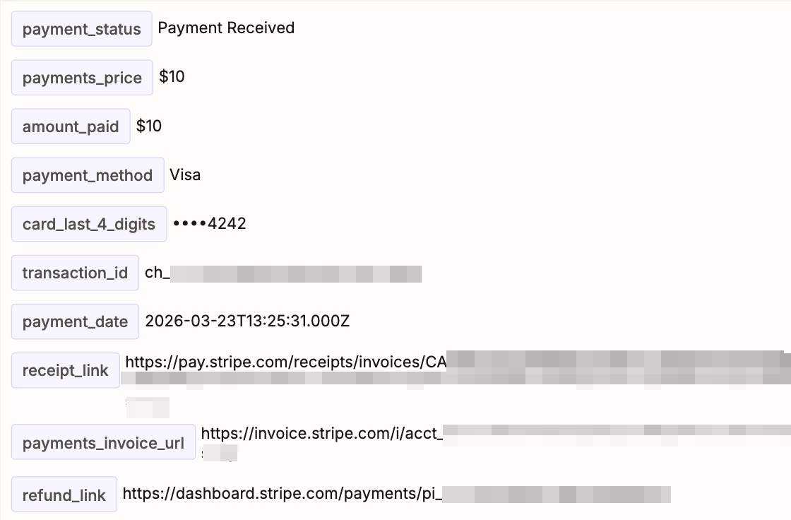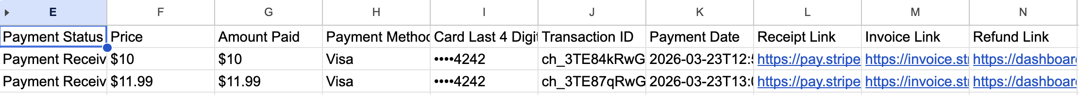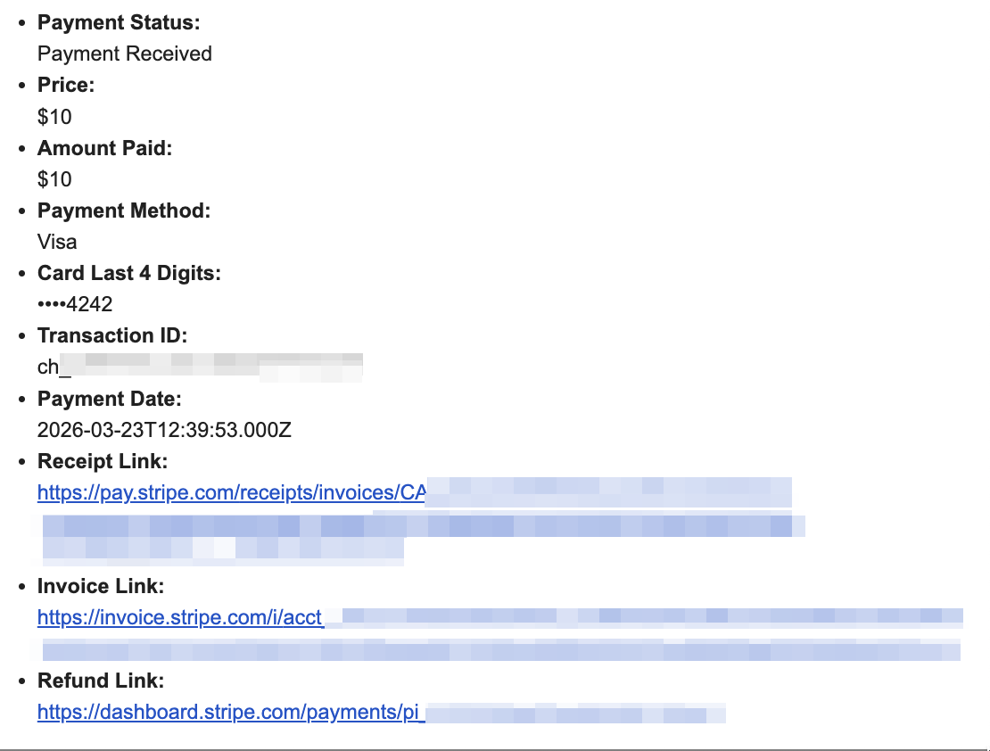 Once payments are enabled, you can access the payment data in your Stripe Dashboard and your submission notifications. The following payment details will be transferred: