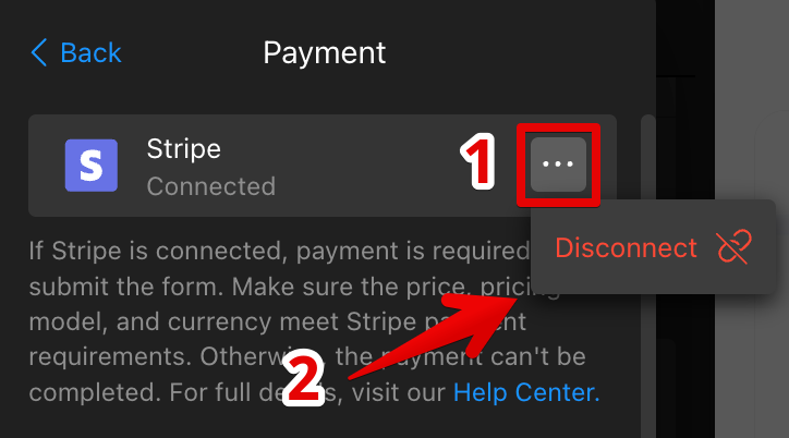 When you're ready to switch to Live mode, in the widget editor, open the three dots menu next to Stripe, click Disconnect, and replace the keys with your Live ones: