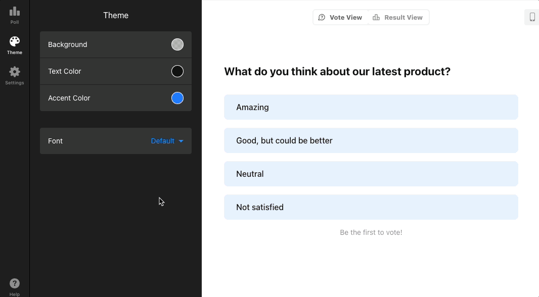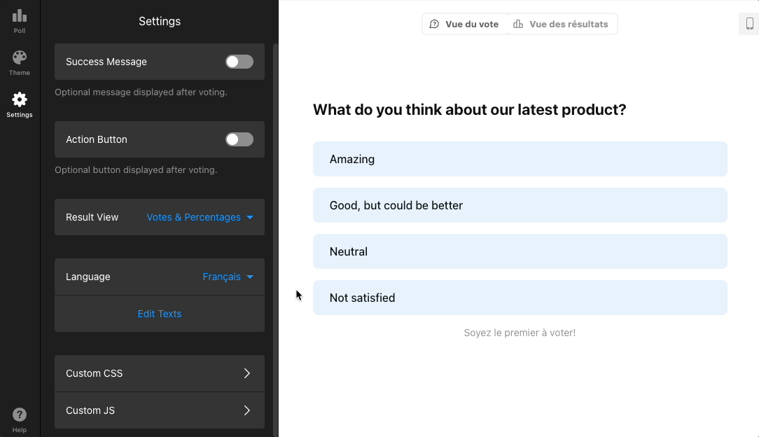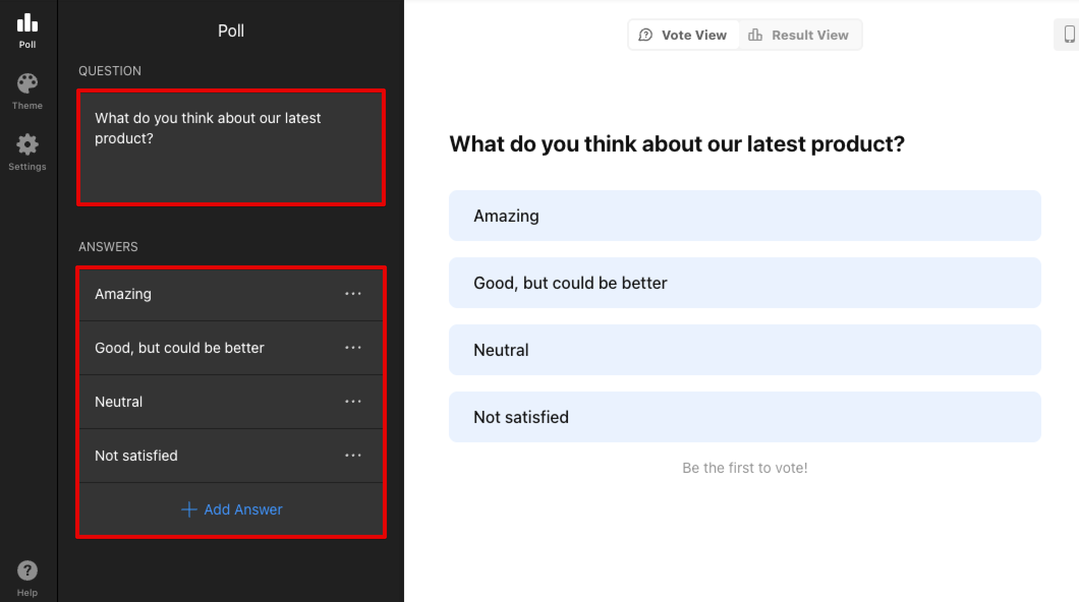 Start by creating your poll and customizing its design. There are three tabs in the Poll widget editor: Poll for your question and answers, Theme for design, and Settings for widget behavior.