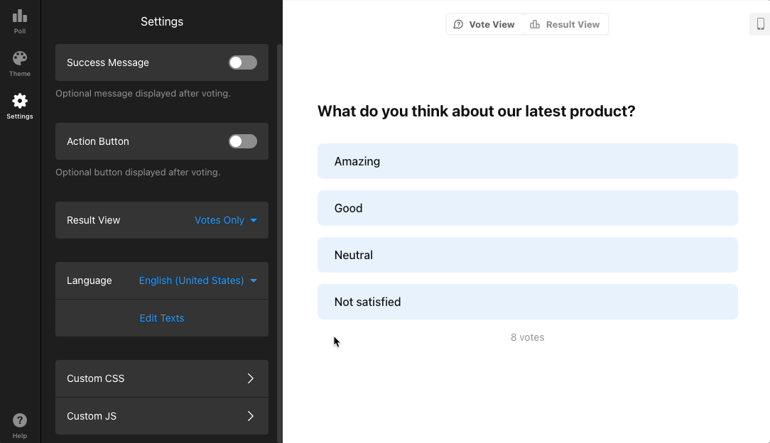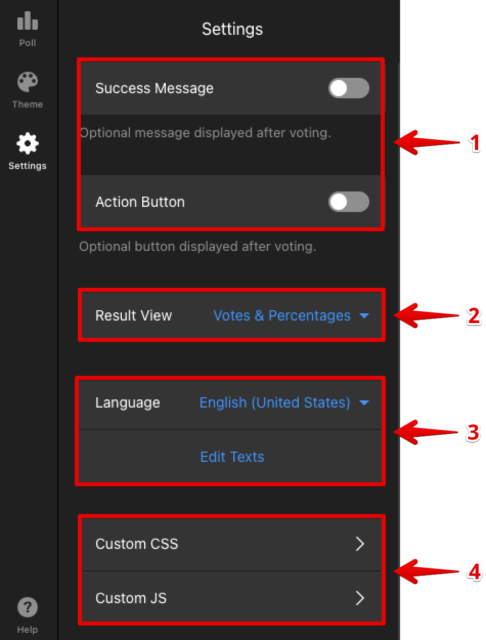 In the Settings tab, you can control what happens after visitors vote and how the results are displayed: