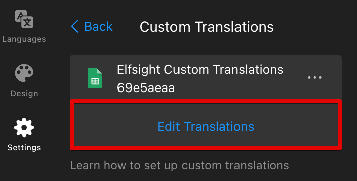 Once connected, a Google Sheet file will be automatically created in your Google Drive. To open and customize it, click Edit Translations in the widget editor: