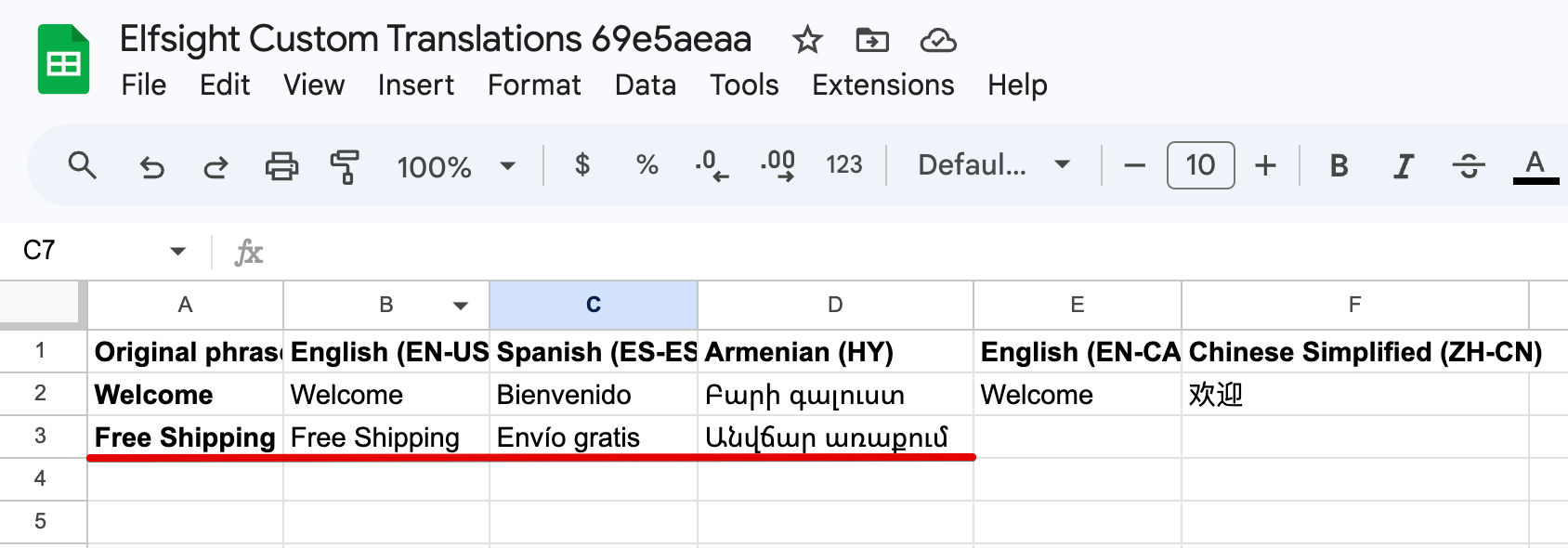 Add your own phrases in the next available rows and enter translations for each language. Leave a cell empty if you don’t want to override the default translation: