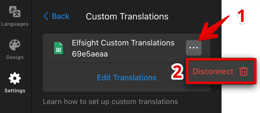If you no longer need custom translations, you can disconnect the integration at any time by clicking the three-dots menu next to your file and selecting Disconnect: