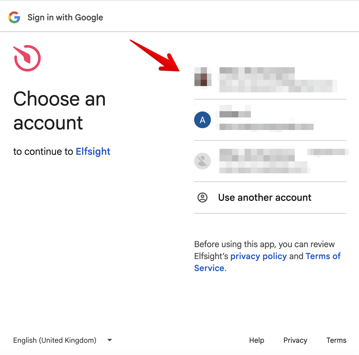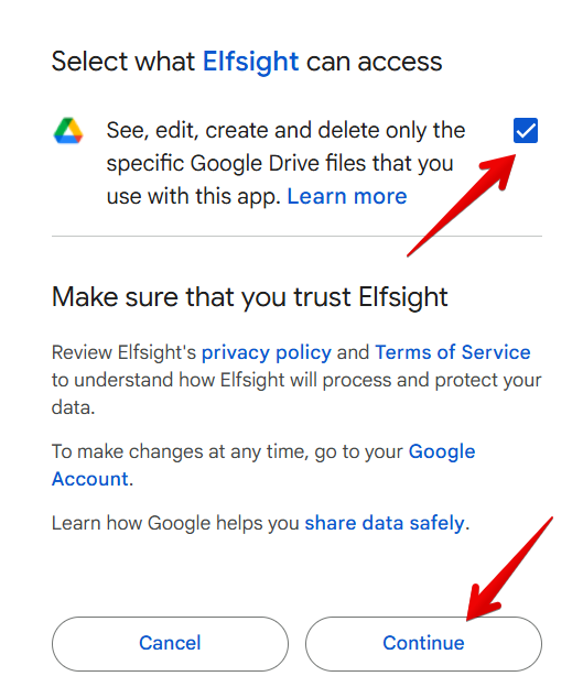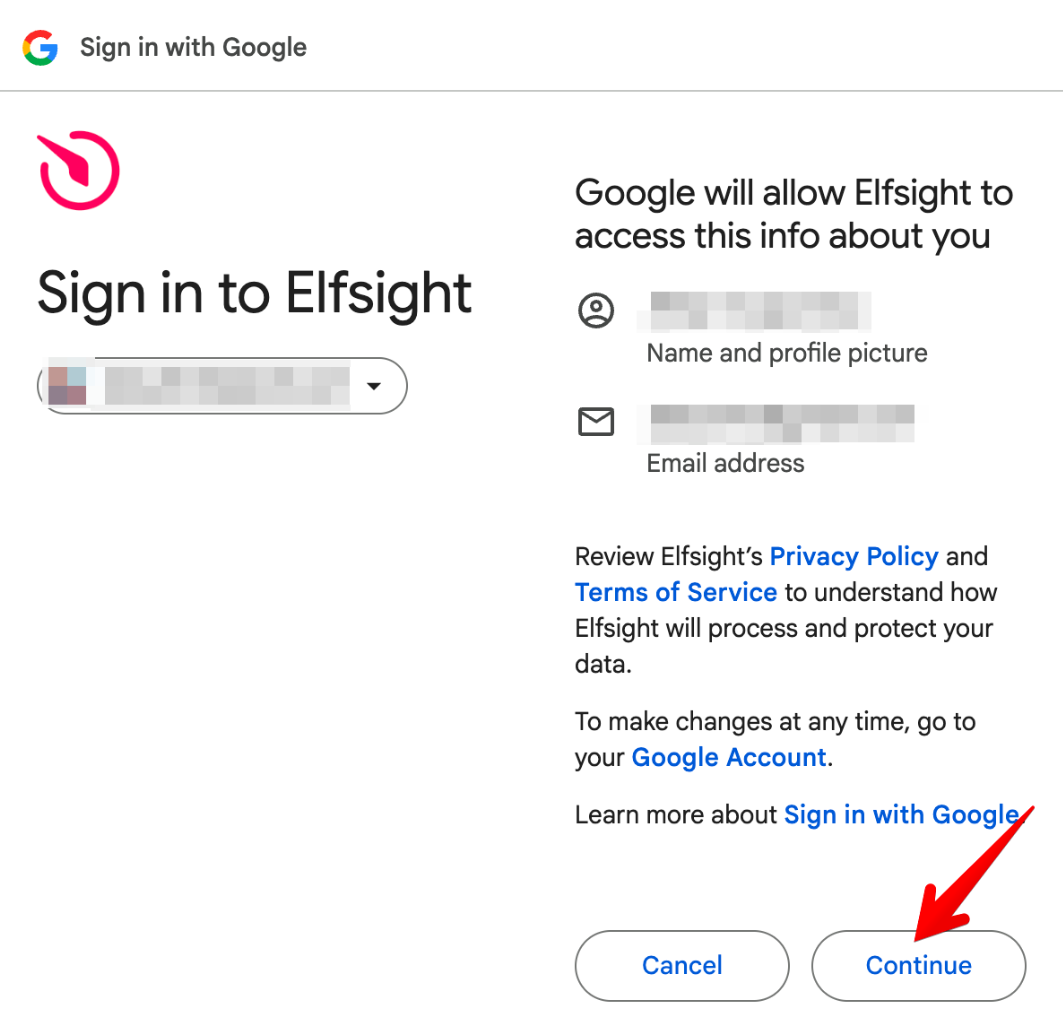 In the pop-up window, choose the Google account you want to connect and click Continue: