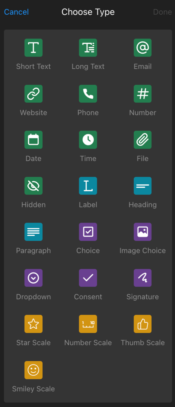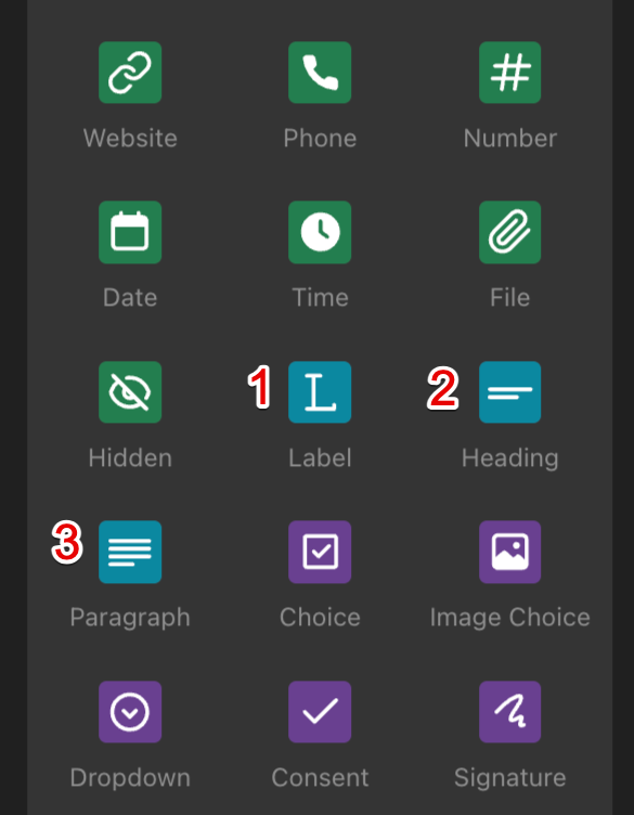 Form elements are the building blocks that allow you to construct your form. Our Form Builder offers four types of elements, each serving different functions and identified by unique colors. They are:
