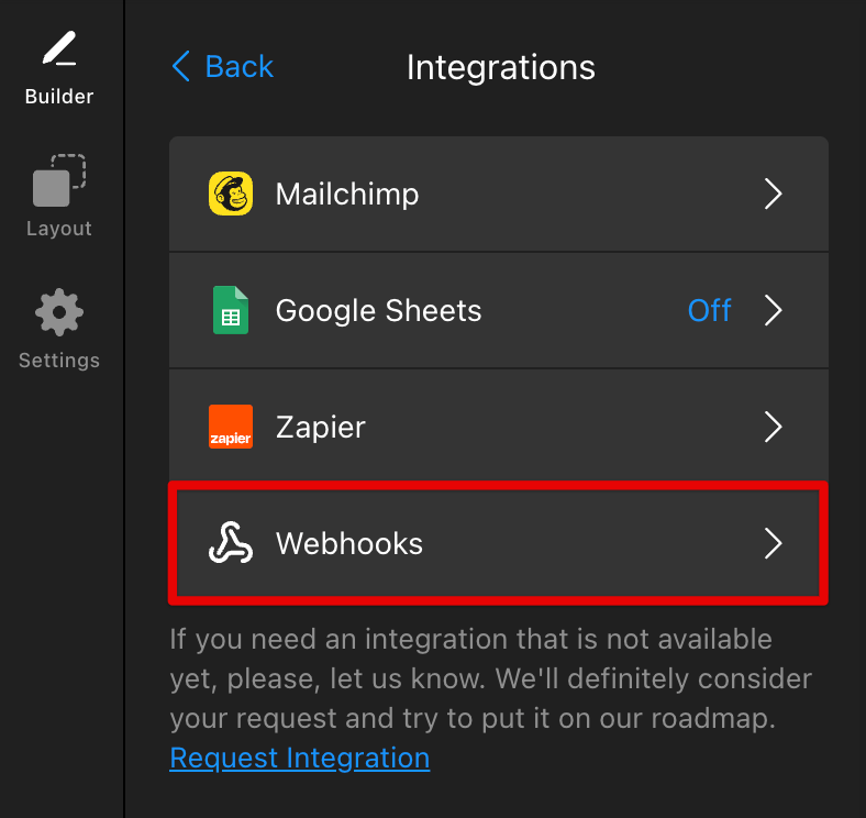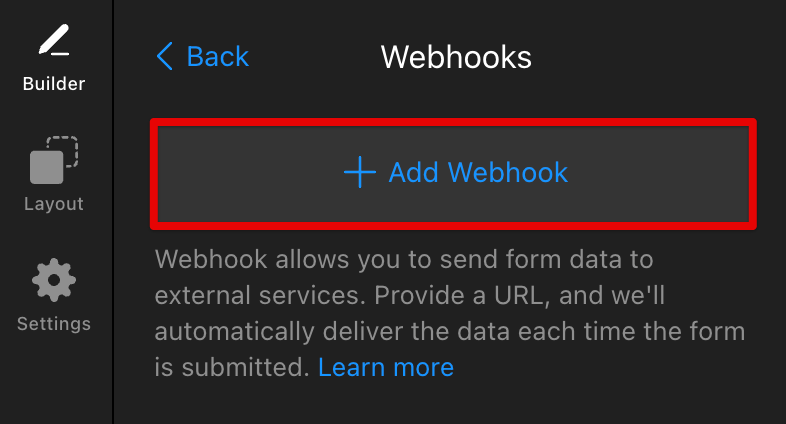 With webhooks, you can send your form submission data to any URL, making it simple to integrate with other apps and services. To forward submissions via webhooks:
