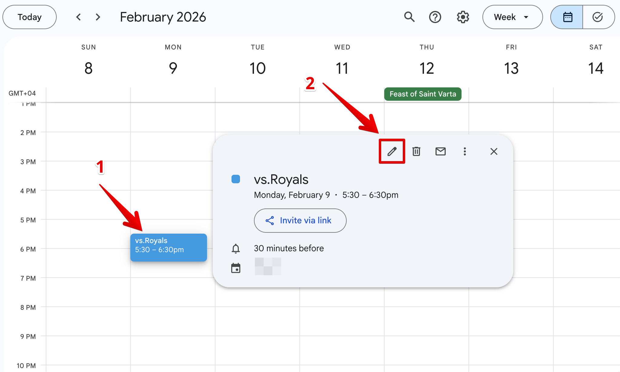 Open the Google Calendar connected to your widget, select the event, and click the Pencil (Edit event) icon: