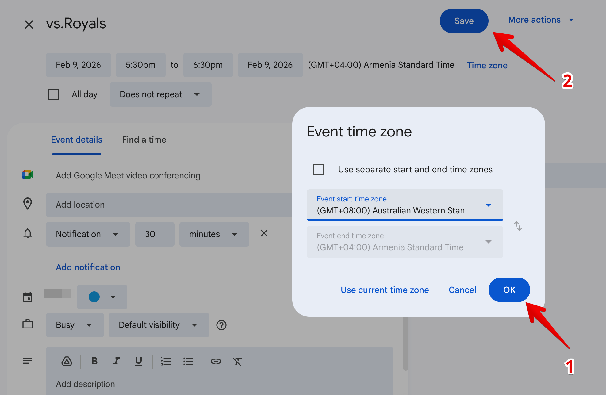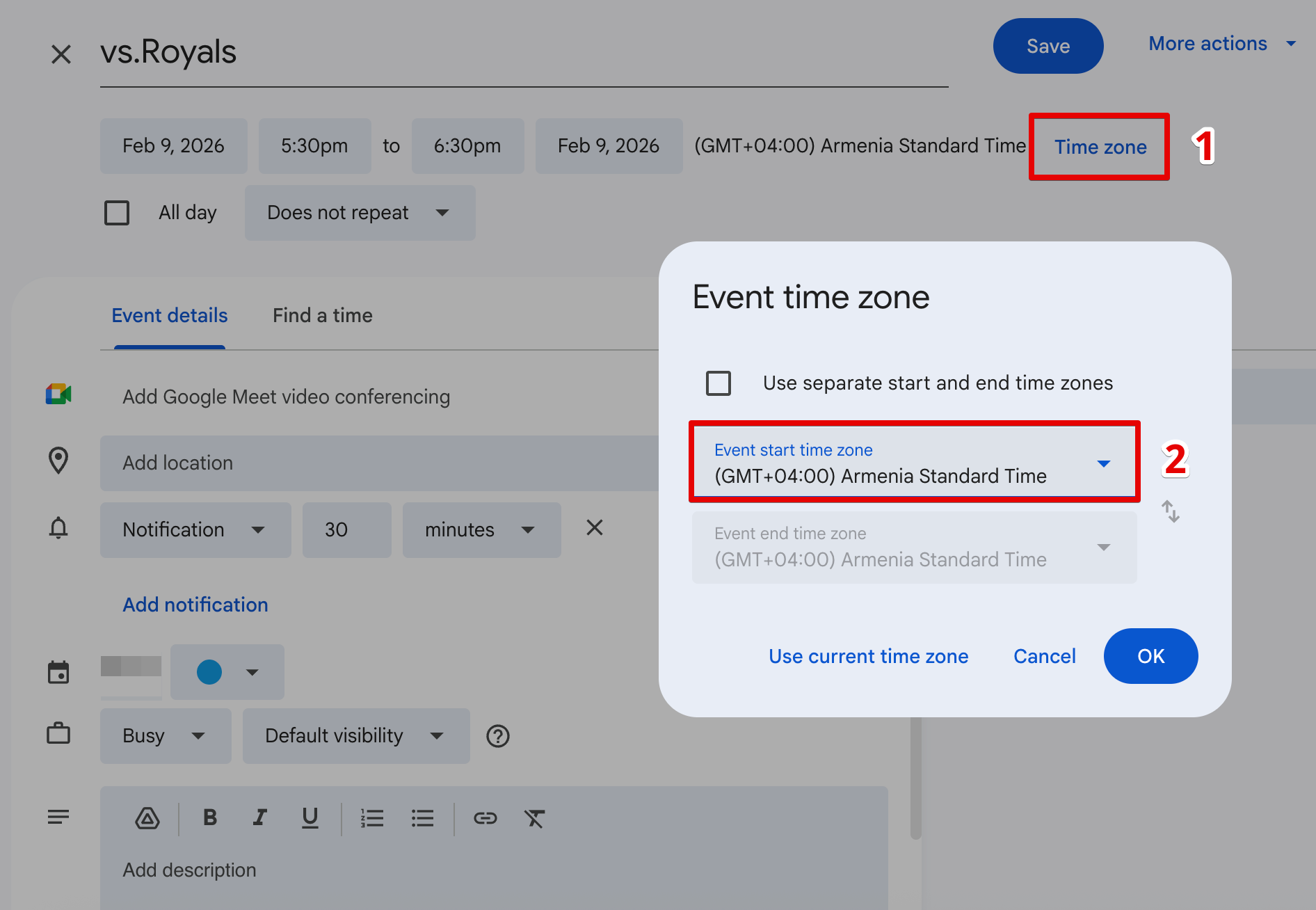To configure the time zone for your event in Google Calendar, follow these steps: