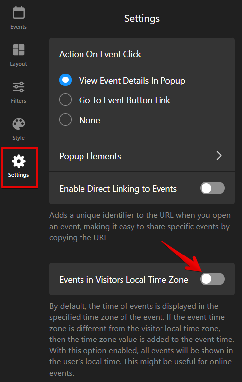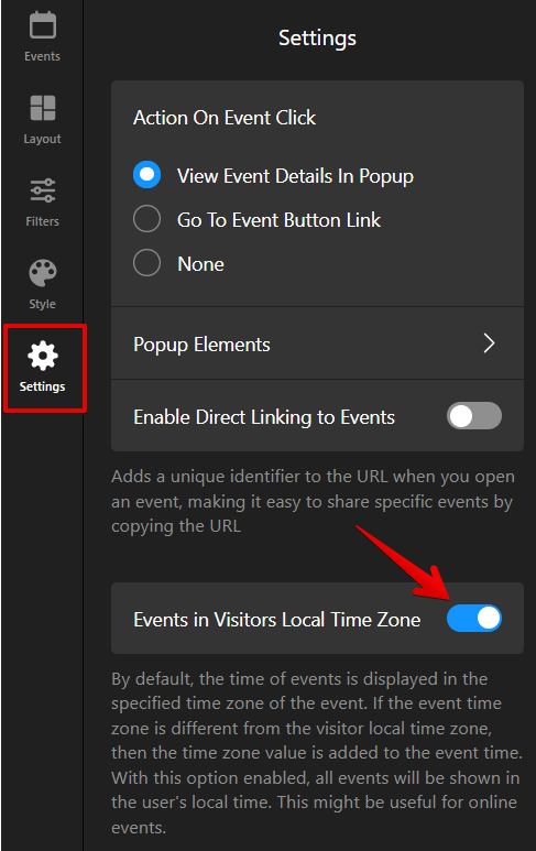 To achieve this, simply enable the Events in Visitors Local Time Zone option on the Settings tab:
