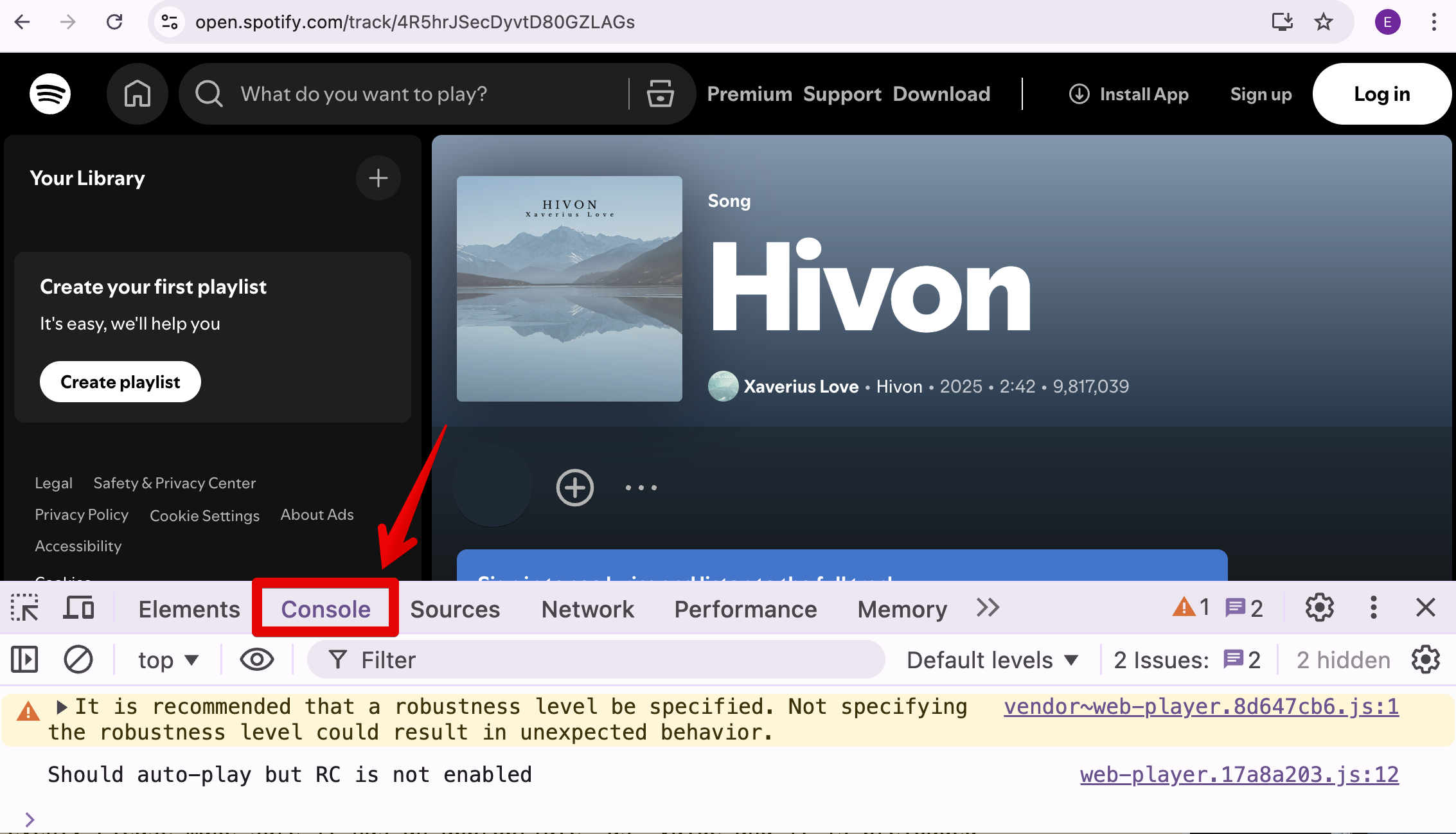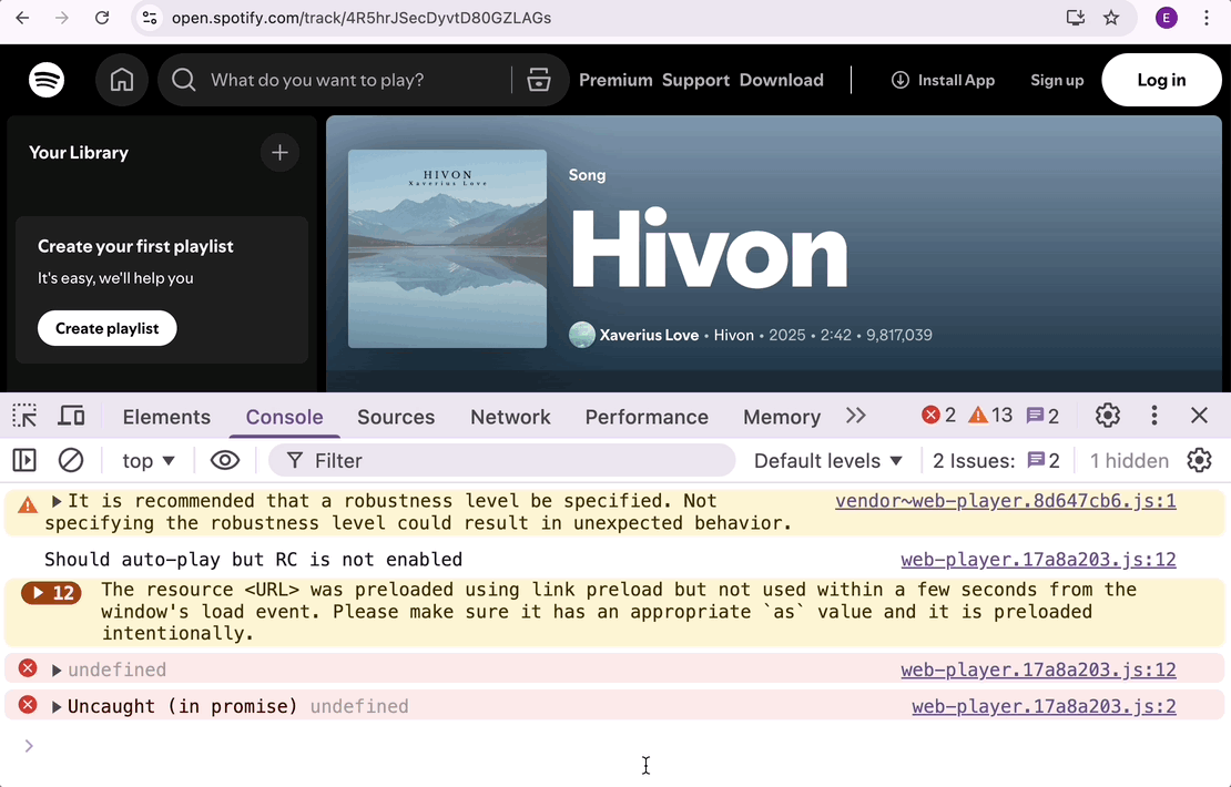 (async () => { const urlMatch = location.href.match(/track\/([a-zA-Z0-9]+)/); if (!urlMatch) return console.error('✖️ Open the track page at open.spotify.com/track/...'); const trackId = urlMatch[1]; const html = await fetch(`https://open.spotify.com/embed/track/${trackId}`).then(r => r.text()); const nextDataMatch = html.match(/<script id="__NEXT_DATA__[^>]*>([^<]+)<\/script>/); if (!nextDataMatch) return console.error('✖️ Track data not found'); const entity = JSON.parse(nextDataMatch[1])?.props?.pageProps?.state?.data?.entity; const previewUrl = entity?.audioPreview?.url; if (previewUrl) { console.log(`%c✔️ "${entity.name}" - ${entity.artists?.[0]?.name}`, 'color: #1DB954; font-weight: bold;'); console.log(`%c${previewUrl}`, 'color: #1DB954; font-size: 14px;'); const el = document.createElement('textarea'); el.value = previewUrl; document.body.appendChild(el); el.select(); document.execCommand('copy'); document.body.removeChild(el); console.log('📋 Copied to clipboard!'); } else { console.warn(`🔇 Preview not available - "${entity?.name}" (not provided by the label)`); } })(); - 4