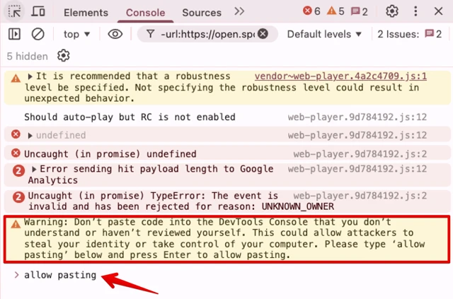 If your browser blocks pasting, simply type allow pasting in the Console, press Enter, and try again: