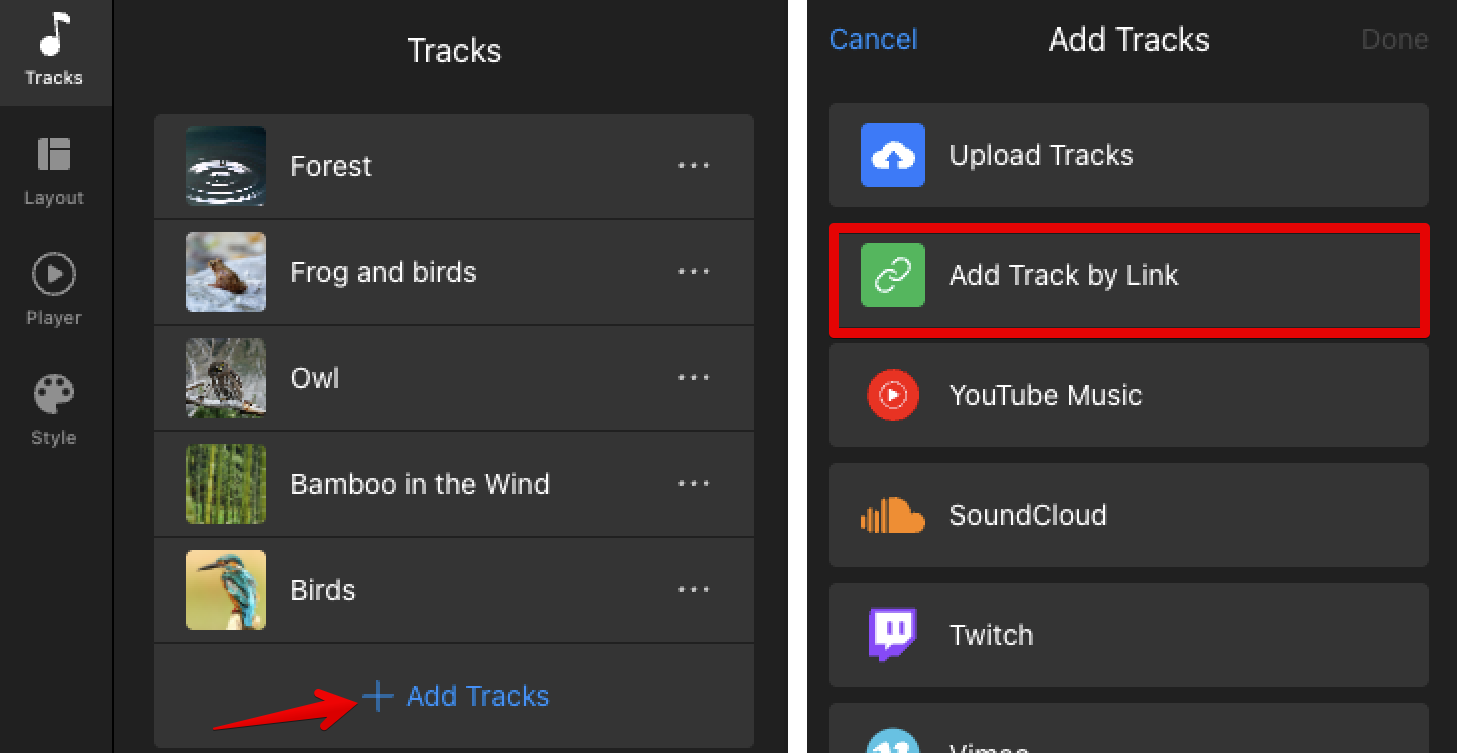 Paste the link into your widget by clicking + Add Track → Add Track by Link: